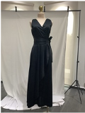 • VESTIDO NEGRO LARGO ESCOTE EN V ROSA DRAPEADO